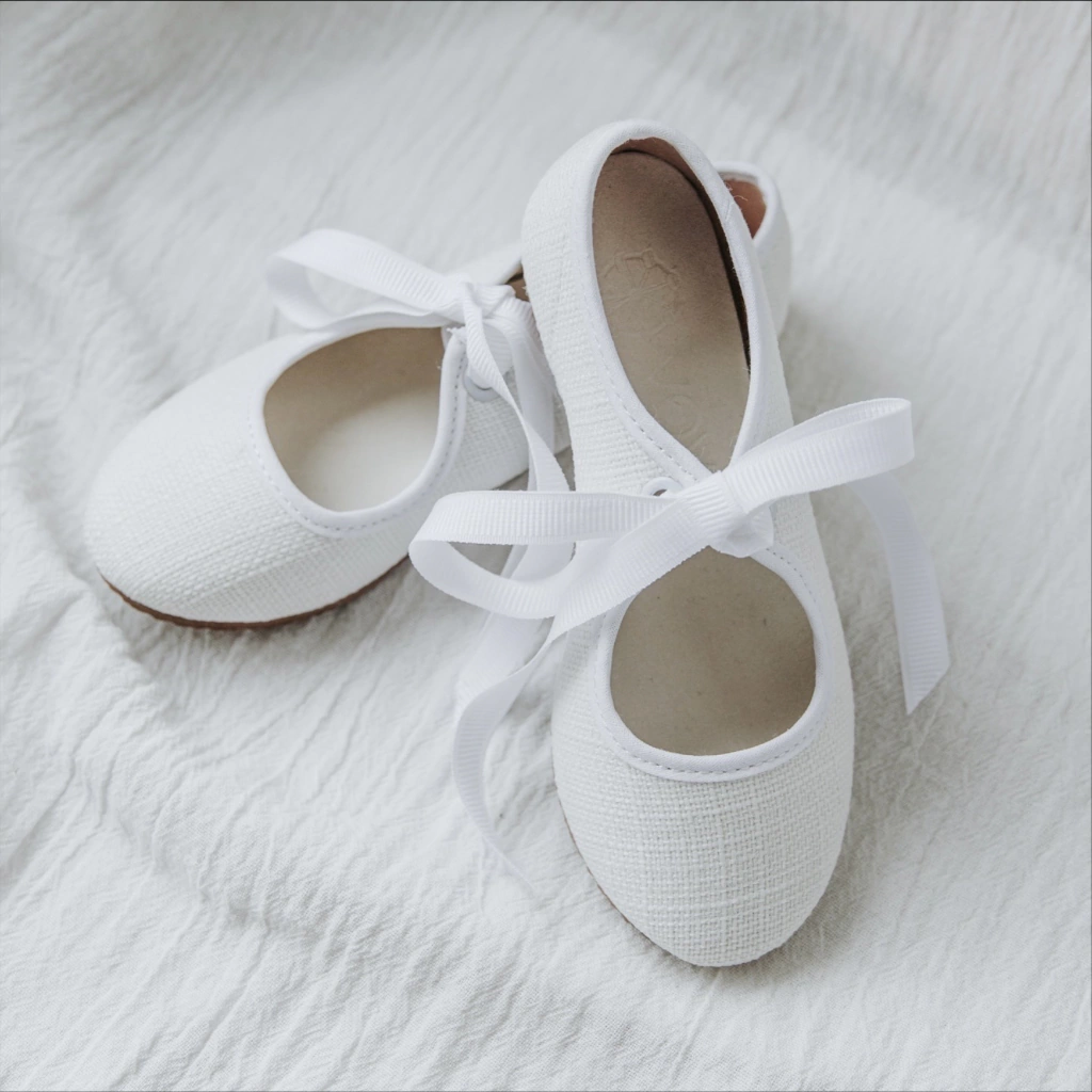 Confeccionadas en lino, color off white, con tratamiento antimanchas, súper resistente, con vivos blancos. Forrería sintética y base plana de goma antideslizante, lo que permite seguridad en la pisada para garantizar horas de juego. Acceso a través de un lazo con moño de cinta gross que les da elegancia y distinción al calzado.